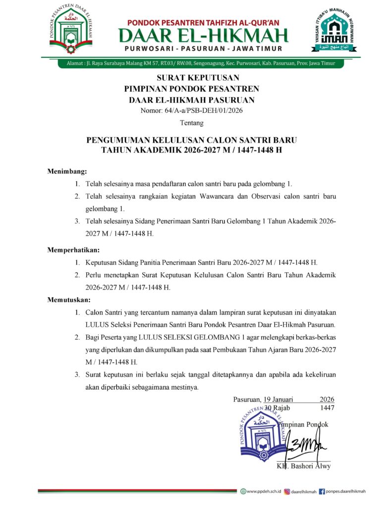 Bismillahirrohmaanirrohim, berikut kami lampirkan Surat Keputusan Kelulusan Penerimaan Santri Baru Tahun Ajaran 2026-2027 Gelombang 1, bagi nama-nama santri/wati yang tercantum dalam surat ini, diharapkan untuk melakukan pembayaran Daftar Ulang dengan rincian sebagai berikut: